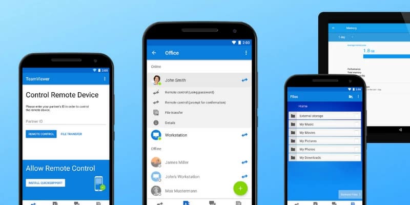 TeamViewerは、Androidデバイスで動作する別のリモートコントロールソリューションです。これにより、任意のネットワーク接続場所からAndroidを搭載した任意のコンピューター、スマートフォン、またはタブレットにリモートで接続できます。Windows、Linux、またはmacOSを実行しているコンピューターをサポートし、ユーザーがAndroidデバイスから接続したコンピューターを完全に制御できます。